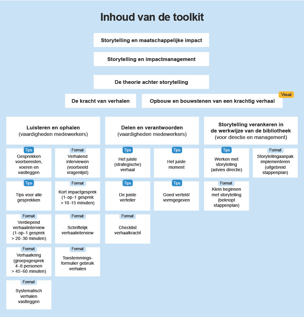 Maar hoe verzamel, vertel en gebruik je deze verhalen effectief? Om je hierbij te helpen, ontwikkelde Probiblio in samenwerking met InsideStory de toolkit storytelling. Deze toolkit bevat diverse praktische documenten waarmee je verhalen kunt inzetten voor communicatie, verantwoording, evaluatie en impactmanagement.