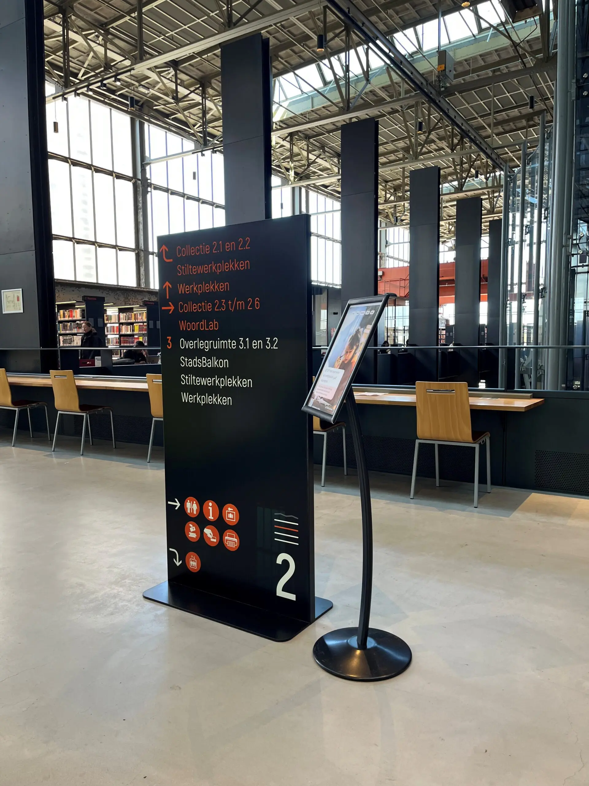 - Binnen bij de entree: zorg voor duidelijke bewegwijzering vanaf de ingang naar de belangrijkste plekken, zoals een servicepunt, uitleenbalie, Taalcafé of de toiletten. Inventariseer per vestiging welke plekken dit voor jouw bibliotheek zijn.